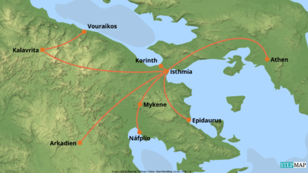 Es gibt ein gutes Netz öffentlicher Verkehrsverbindungen mit Inlandsflügen und Fähren, in Athen ein U-Bahn-Netz und eine Tramlinie sowie Busverbindungen.