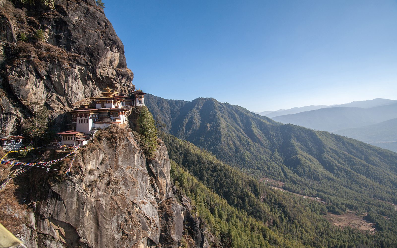 Im Dunst aufsteigender Nebelschwaden wirkt das sagenumwobene Taktshang Palphug Kloster geradezu mystisch. Es schmiegt sich spektakulär an einen steilen Felsen im Himalaya-Gebirge Bhutans. Farbenfrohe Gebetsfahnen flattern in der luftigen Höhe rund um die vier Haupttempel und die kleinen Wohnstände im Wind.