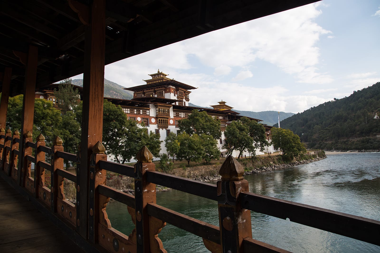 Die eindrucksvolle Klosterburg von Punakha, auch als “Palast der Glückseligkeit” bezeichnet, ist die wohl schönste Festung in Bhutan. Der zweitälteste und zweitgrößte Dzong des Landes liegt unmittelbar am Zusammenfluss des Mo Chuu und des Pho Chuu. Im Hintergrund erheben sich eindrucksvolle, sattgrün bewachsene Berge. Ein unvergesslicher Anblick.