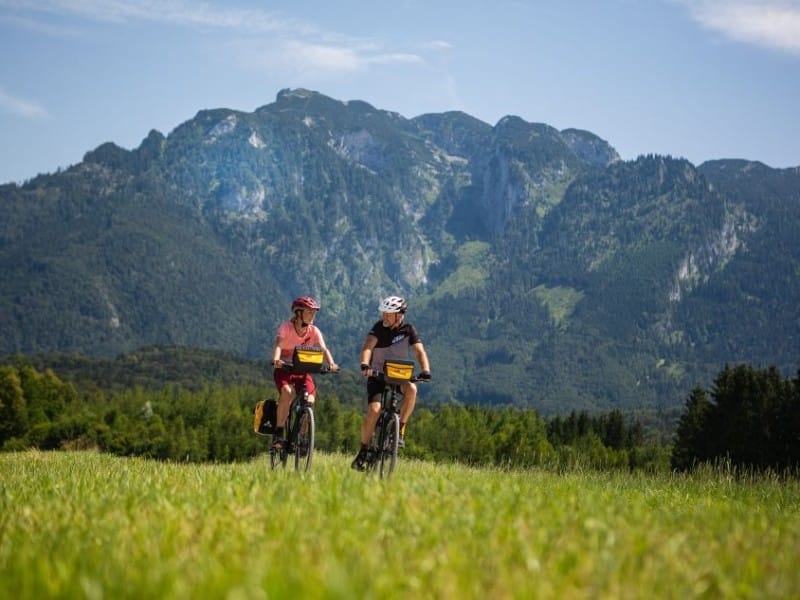 Alpe-Adria Radweg BergpanoramaAlpe-Adria Radweg Radfahrer LandschaftAlpe-Adria Radweg Wiese Radler