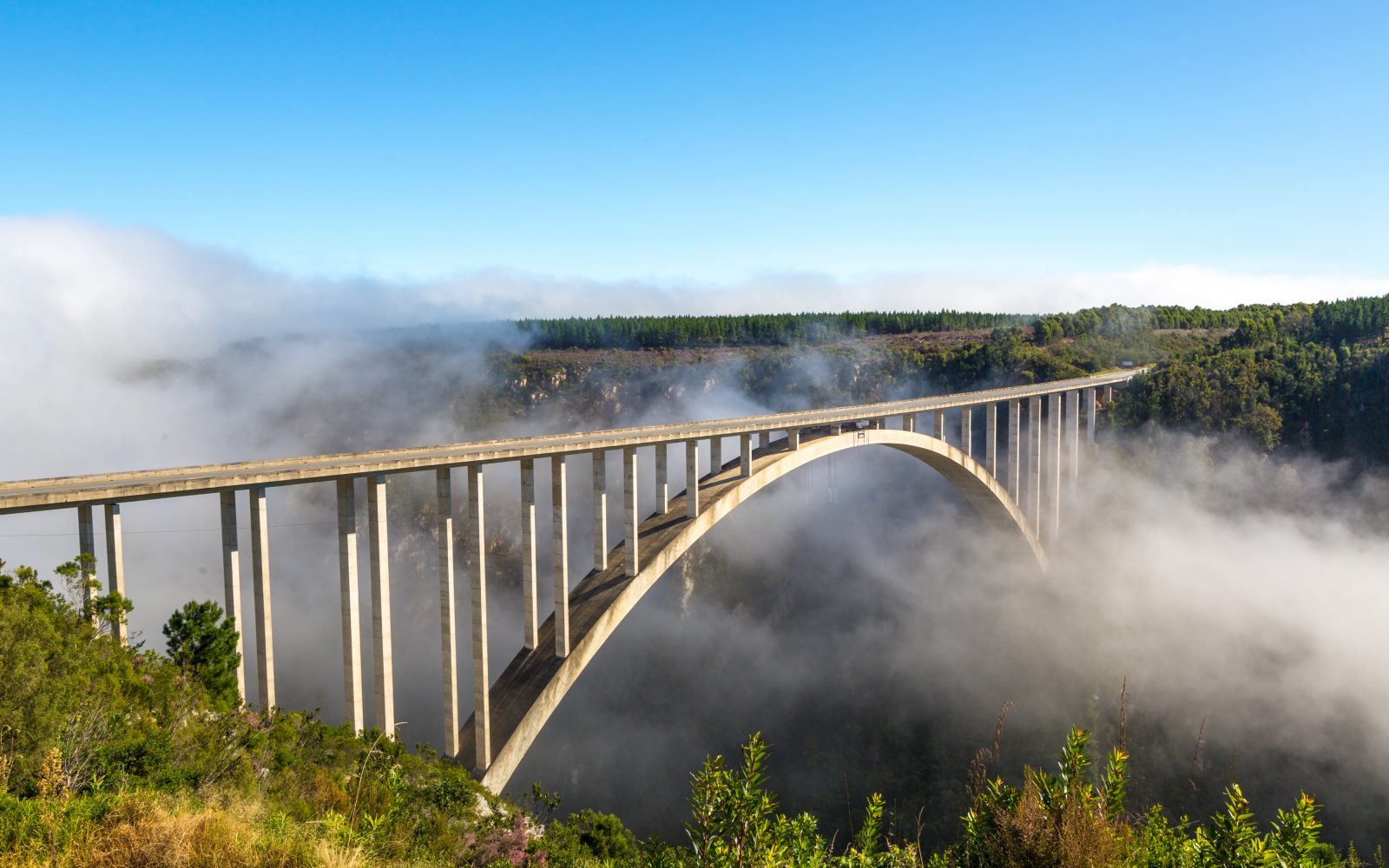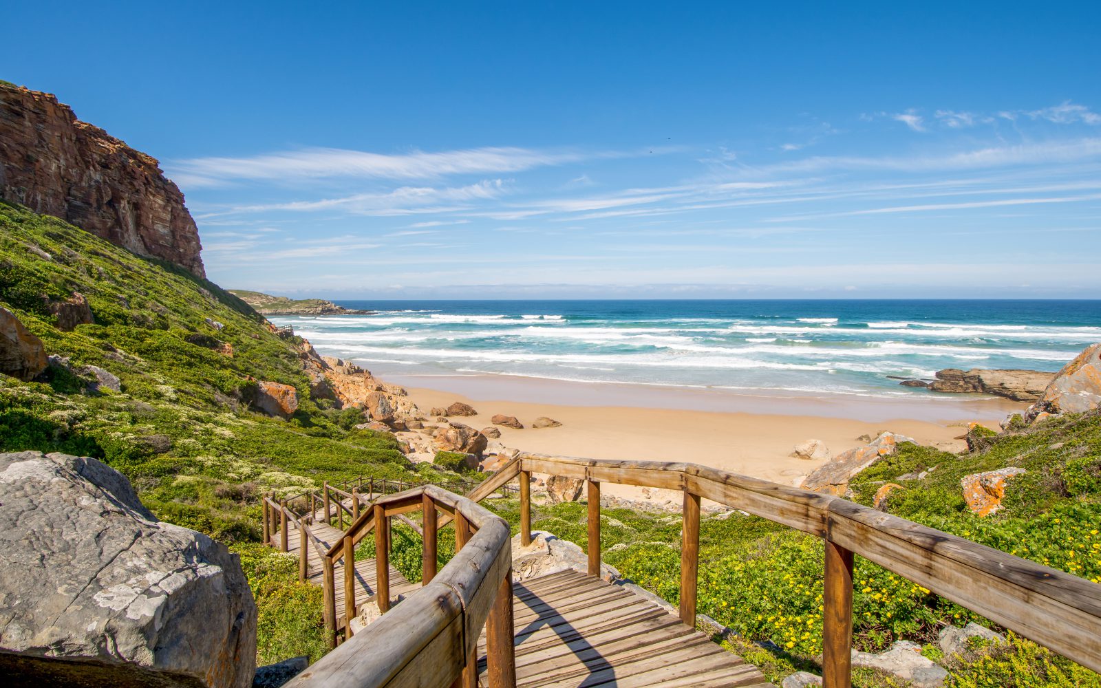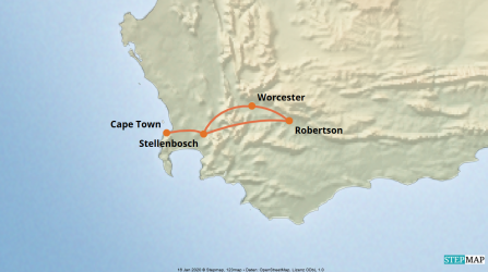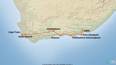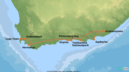 Zu den schönsten Panoramastraßen der Welt zählt die Garden Route, die östlich von Kapstadt parallel zur Küste durch Weinberge, üppige Wälder, vorbei an steilen Klippen und weiten Sandstränden verläuft. Waghalsige Hängebrücken und kurvige Eisenbahnviadukte lassen Sie auf erste Tuchfühlung mit dem tiefen Blau des Indischen Ozeans gehen.