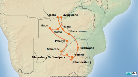 Entfernungen: River View Lodge-Nata ca. 300 km, 4 Stunden