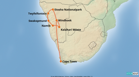 Diese Tour führt Sie von Kapstadt, einer der schönsten Städte der Welt in Richtung Norden nach Windhoek, der Hauptstadt Namibias. Auf Ihrem Weg ist die wilde West Coast mit ihren malerischen Orten wie Langebaan oder Lambert's Bay Ihr stetiger Begleiter, ehe Sie am Cederberg vorbei in die unendlichen Weiten Namibias abtauchen. Landschaftliche Höhepunkte erwarten Sie am Fish River Canyon und Sossusvlei, ehe Sie den Atlantik in Swakopmund wieder erreichen.